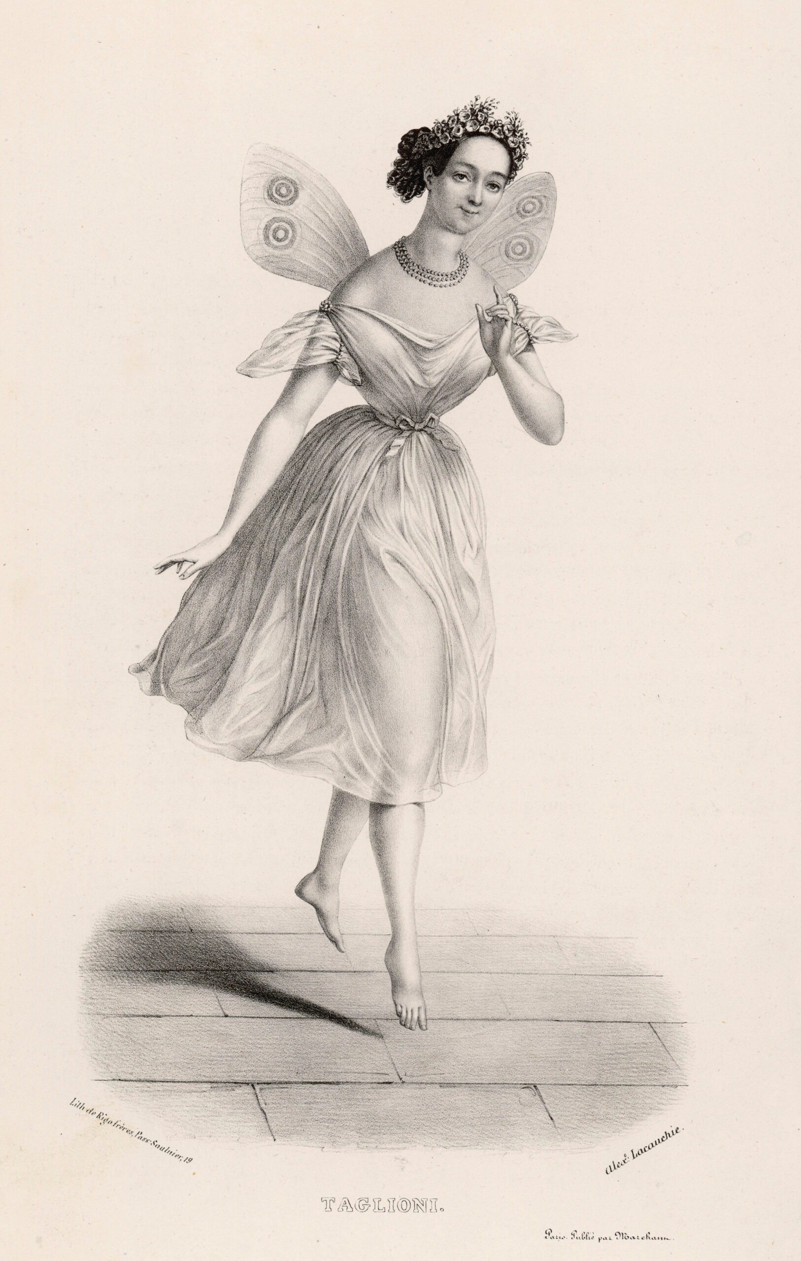 When ballet dancers first explored the possibility of dancing on the tips of their toes in the satin, heel less slippers which were then fashionable in the 1820s and 1830s, they wanted to project the illusion of weightlessness which, of course, they were already demonstrating with their jumps. At the time in well-equipped theatres, weightlessness was often achieved using harnesses, usually positioned underneath the wings in the dancer’s costume. It’s difficult to imagine how liberating it must have been for dancers such as Marie Taglioni to have broken free of her reliance on ropes and pulleys and to be able to perfect a sylph-like impression just with her own technique and stiffened shoes.